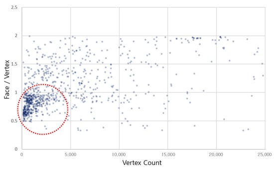 We analyzed the data of 900 test data sets from Princeton Modelnet10 and found that the face/vertex ratio value was concentrated to a value of less than 1, as shown in Figure 14. This shows that most of the geometries consist of fewer faces than the number of vertices. This analysis demonstrates that in terms of data efficiency, can perform structurization through a smaller matrix size than and learning proceeds better.