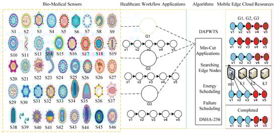 This study devises Dynamic Application Partitioning Healthcare Workload Task-Scheduling Secure (DAPWTS) schemes, as shown in Figure 1. The architecture consists of biomedical sensors, workflow application interfaces, and resource layers. Many biomedical sensors are connected to the application interface. Each sensor generates data and runs inside application workflows at the user level. Heavyweight data requires a lot of resources to run applications. However, due to resource constraints, mobile devices running locally cannot satisfy the requirements. Therefore, this study devises a DAPWTS algorithm framework consisting of different schemes, such as secure min-cut algorithm, searching node, energy, and failure-scheduling schemes. The goal is to minimize energy consumption of nodes and divide the application between local nodes and edge nodes by applying the min-cut algorithm. After partitioning the applications, the node-search algorithm optimally searches to run applications under their deadlines. The energy and failure schemes maintain the energy consumption of the nodes and the failure of the system. After execution, all the task data will be stored based on a dynamic message-digest algorithm (MD5). The security validation of data in workflow applications is necessary. All tasks of one application are run on different nodes and share their data without backtracking in the system.