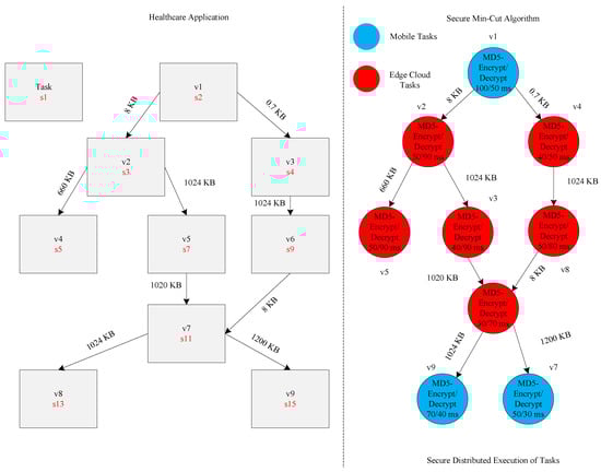 Figure 2 shows the procedure of a secure min-cut algorithm for a healthcare application. The study assumes that the application consists of different workflow tasks, e.g., . All tasks are taking data from different biosensors such as . The secure min-cut algorithm divides the applications based on available resources, encryption and decryption time, and task deadline, where denotes edge-cloud execution time and mobile execution time. The blue nodes are those tasks being executed on mobile devices, and red tasks are being executed on the edge-cloud nodes. Each task at the node encrypts data with a message-digest algorithm (MD5) and decrypts data with the same algorithm. The data size is measured in kilobytes (KB) between nodes during the execution of applications. The study modified the existing MD5 [16] with dynamic encryption and decryption schemes. It can handle failure of tasks due to resources or service unavailability in the system.