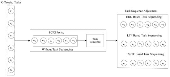 We rank all tasks onto a virtual machine based on the HEFT [28] heuristic, and added weight to all nodes and edges according to their priorities. All data offloaded to the system follow a first-come-first-served policy and are sequenced by all proposed methods as shown in Figure 3. We define a set of sequence rules as follows.