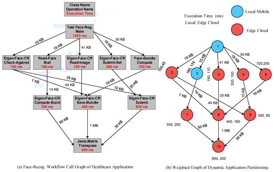 Dynamic application partitioning, which involves separating mobile application runtimes between local execution and remote-cloud execution to optimize total cost, is a vital component of the offloading system [5]. Edge-cloud data centers are a subset of remote-cloud data centers and have fewer computational capabilities, lower processing speed, and less memory capacity than remote-cloud data centers [6]. There are two runtimes for program execution in the offloading system; however, present research, which focuses on mobile energy savings, ignores cloud resource energy use. It is evident that cloud resources are critical to performance; however, if the offloading system does not effectively control resources, it may not be reliable enough to execute an application. After partitioning the program into local and edge-cloud execution, scheduling all jobs on the mobile device and edge-cloud resources is critical. Existing papers [7,8,9] have not included task-scheduling and security aspects in their suggested system, because variability in cloud resources, network connections, and mobile devices make static offloading with fixed bandwidth and resource values unreliable. Security inside the mobile edge-cloud network has been ignored in existing application-partitioning schemes in the system. This research looks at the mobile offloading system’s deadline-constrained energy-aware dynamic application-partitioning and job-scheduling challenges in diverse contexts. When performing the offloading system, the goal is to reduce mobile and cloud resource energy consumption. The problem is divided into two sub-problems: first, we divide the application into two parts: local and edge-cloud execution. The application-partitioning decision takes into account network bandwidth, cloud resources, and job size. Then, all partitioned jobs are scheduled on local devices as well as the edge cloud. The aim of this study is to reduce the amount of power used by mobile devices and edge servers and still meet application deadlines. The failure of nodes is also considered in this study of healthcare applications. The study is going to solve many issues of existing application-partitioning methods. However, all existing application methods and frameworks have faced the following issues.