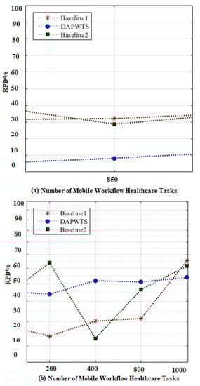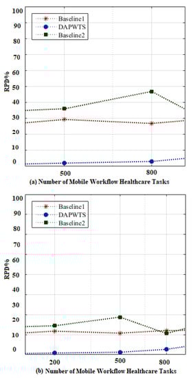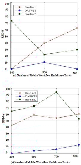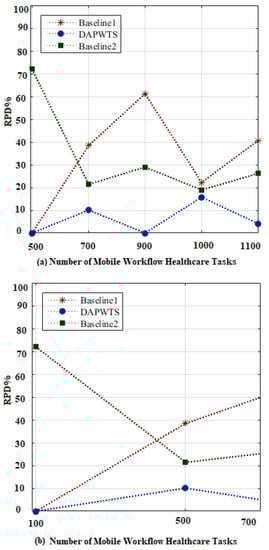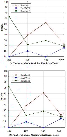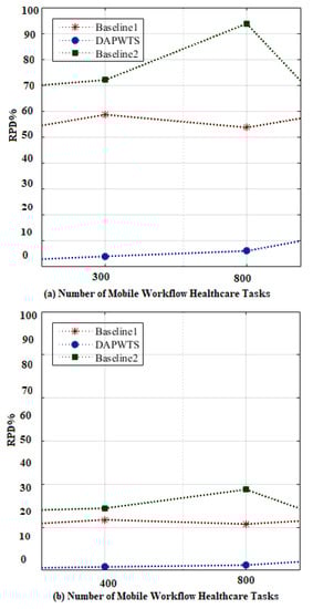 To evaluate the performance of the proposed DAPWTS algorithm next to the healthcare heuristics-based DEA benchmark [19,20] that determines the effectiveness of the proposed algorithm. The calibration parameters of tasks are the same as a healthcare workflow; the performance evaluation of the DAPWTS is measured at different deadlines. The DAPWTS has RPD (relative percentage division), which is used to compare with existing schemes such as non-offloading, and is described as follows: