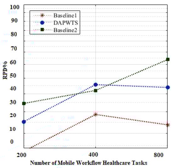 The variable is exploited as tightly valued to run workflow applications . Figure 6 shows that 0.8 is best among all adjustments and with the proposed task sequence rules. Based on the ANOVA technique, Figure 6 describes the mean plot of using 95.0% Tukey HSD intervals. It can be observed that RPD% reduces when increases from 0.2 to 0.4. Existing heuristics such as Baseline1 and Baseline2 were compared with proposed DAPWTS-based algorithm components. We evaluated the overall performance and validity based on the above components, and all RPD results proposed that the algorithm is better when compared to all benchmark heuristics bound by deadline constraints [28,30,31].
