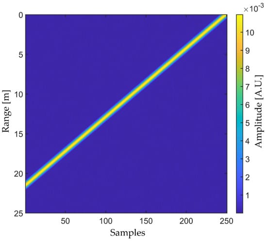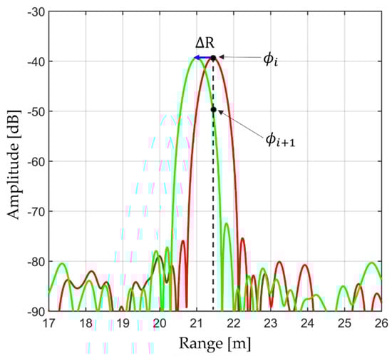 The method was tested with simulations considering the configuration in Figure 1 and the echo in Equation (2). The radar image was obtained by calculating the IFFT (inverse fast Fourier transform) of the echo. The echo was windowed (in frequency domain) using a Kaiser window with . The initial frequency was , the bandwidth was , the number of tones was 2666, and the tone interval was (so the sweep time was ). A Gaussian noise () was added to the echo.
