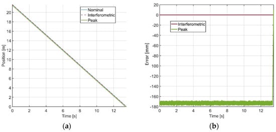 Two more realistic speed profiles were considered. In Figure 6, we suppose that the GPR was moving at a constant speed of along the path, but was stationary both at the beginning and at the end of the path. The acceleration and deceleration were about (six orders more than the condition in (8)). We observe that the interferometric error was constant during the path at a constant speed (Figure 6b), but the acceleration generated an offset of about 3 mm.