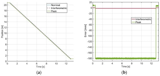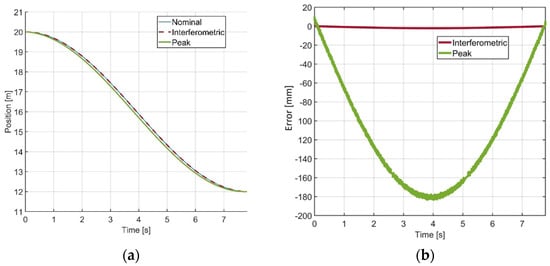 Position retrieved by radar: (a) using the interferometric method (green line) and using the peak position (red line); (b) error with respect to the nominal position.