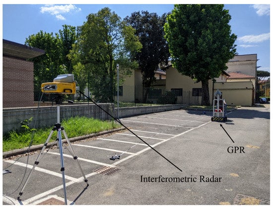 The experimental setup is shown in Figure 8. The interferometric radar used was an IBIS radar by IDS-Georadar, Pisa Italy. The GPR system was ORFEUS, developed by the ESECH Lab within the framework of a European Project [12,13]. ORFEUS provides a CW-SF signal with central frequency and bandwidth. The number of tones of a single weep was 200. The repetition rate was about .