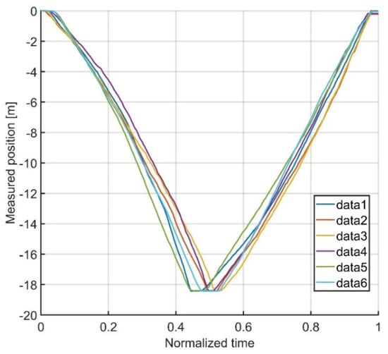 Finally, Figure 7 shows an example of the sinusoidal profile. The maximum speed was 1.6 m/s and the maximum acceleration was (). Figure 7b shows the measurement error that is zero when the speed is almost zero and maximum when the acceleration is at its highest value (). The maximum error was . It is due to the Doppler effect contribution that is not completely negligible when the acceleration is not zero.