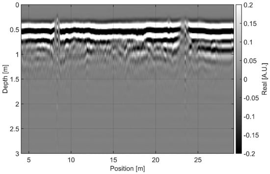 Finally, Figure 10 shows an example of the B-scan obtained using the proposed method. The position retrieved by IBIS was synchronized and stacked with the sweeps of ORFEUS. The signals at and are related to two storm drains. No other targets are visible in the scanned area [11].