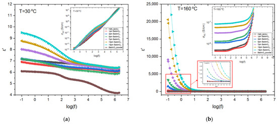 The BaMnO4 nanocomposite systems were characterized electrically by means of BDS. The dielectric response, in the form of the real part of dielectric permittivity and AC conductivity as a function of frequency at 30 and 160 °C, is given for all the specimens under study in Figure 1a,b, respectively.