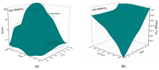Three-dimensional dielectric spectra of the loss tangent (tanδ) and AC conductivity (σAC) as a function of frequency and temperature are shown for the 3 phr BaMnO4 nanocomposite in Figure 2a,b, respectively.