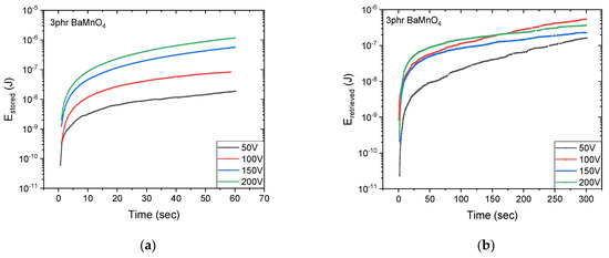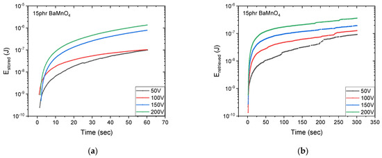 The stored and retrieved energies under a DC electrical field are shown as a function of time at 50, 100, 150 and 200 V for the 3 phr BaMnO4 specimen in Figure 3a,b, respectively.