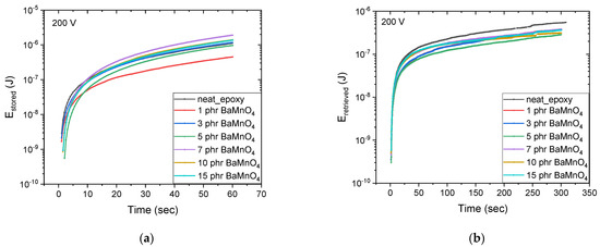The comparative plots for the stored and retrieved energies as a function of time for all examined systems at 200 V are shown in Figure 5. The 7 phr BaMnO4 nanocomposite exhibits the optimum performance, since this system indicates the highest value of both stored and harvested energies compared to other nanocomposite systems. Additionally, it is noteworthy that the Eretrieved of the neat epoxy specimen acquires the highest values among all nanocomposite systems, while the Estored acquires low values. This behavior indicates that charge carriers trapped at the constituents’ interface are able to overcome potential barriers and to migrate. Increasing the applied field via the charging voltage results in lowering potential barriers, favoring the de-trapping of charges and their transport.