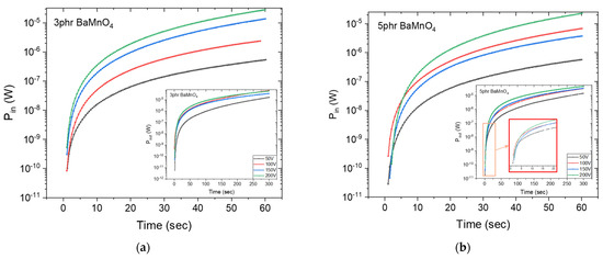 The variation of power as a function of time for the 3 phr and 5 phr BaMnO4 nanocomposites is shown in Figure 6. It is evident that the power Pin of both nanocomposites rises rapidly until the time instant of approximately 5 s and then continues to increase at a slower rate of up to 60 s. Additionally, the specimens deliver their stored power (Pout) promptly at a short period of time and then the remaining power is provided with a constant rate until the time instant of 300 s (insets). It is noticeable that the discharge time is much longer than that employed for charge. This may lead to the conclusion that, although the specimen can be fully charged quickly, it can provide power to its output for a relatively long period of time.