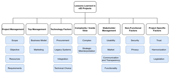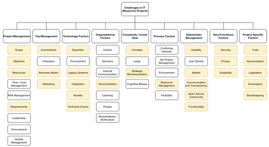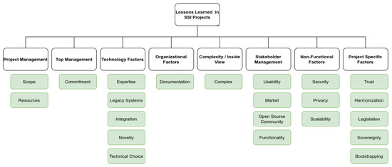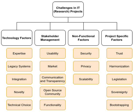 - Project resp. domain-specific factors: challenges that are specific for the project or the domain. We decided to add legislation, regulations, and sovereignty to the project-specific factors since these challenges are rather specific for eIDs and SSI. Nevertheless, they are present to a certain extent in every project. Therefore, it is possible to introduce another category containing them.