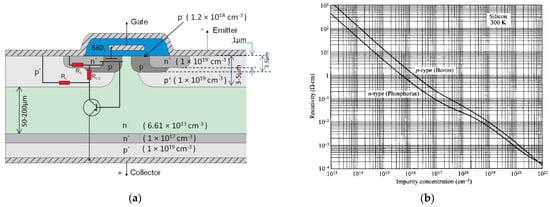 Diagram of IGBT cell (a) and resistivity vs. impurity concentration at 300 K for silicon (b) from [].