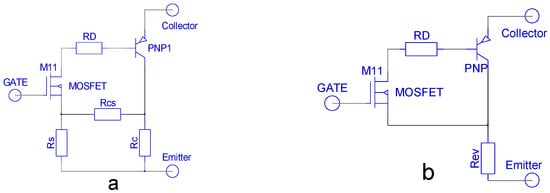 The magnitudes of resistors Rs, Rc, and Rcs (Figure 3a and Figure 4a) depend on the emitter current. As shown in Figure 4, they form a negative feedback loop. The value of these resistors can range from 0.01 to 1 Ohm when the transistor is locked (i.e., VG ≤ Vtr) and within 0.1 and 10 mOhms when the transistor is in active mode (i.e., VG ≥ Vtr) [,,]. This is due to the high doping level of the emitter’s n+ and p+ layers (Figure 3b) and therefore their low impedance of 1–10 mOhm/sm [].
