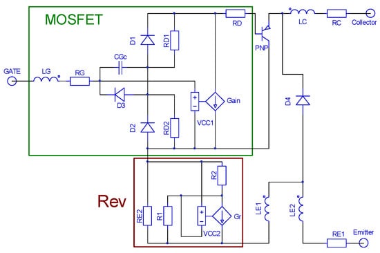 Their values are specified in the modeling process by correlating them with the measurement results. The initial value can be selected according to the concentration of dopants in the IGBT emitter layers [,,]. Their values range from R1 = 0.1–1 mΩ, R2 = 0.1–1 mΩ, and RE2 = 0.1–1 Ω. The new scheme in Figure 5 is more accurate than the one represented in Figure 2, as shown in Figures 10–12 in Section 3.