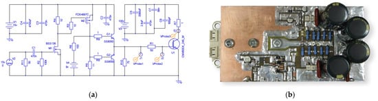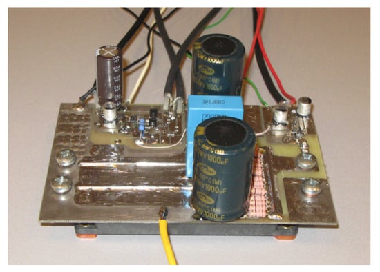 The IGBT under investigation had an R7 load on the collector, which comprised 18 Ω 2W low-inductive resistors connected in parallel. To decouple the power supply line from the test-bench PCB, several capacitors (C2–C8) of different types were used. Section 3 describes the test-bench examples and results.