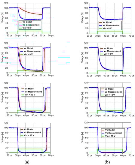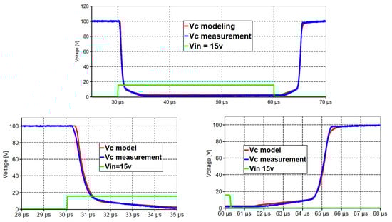 Figure 12 and Figure 13 represent the results for 15 V of input. Once again, the new model demonstrated high accuracy in comparison with measurements.