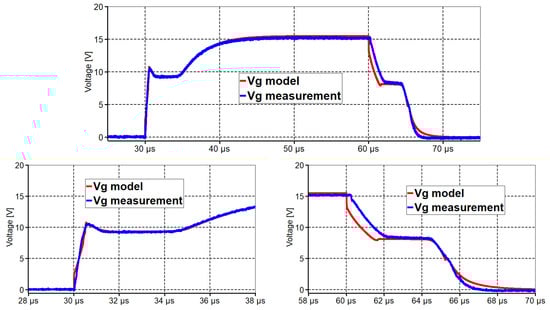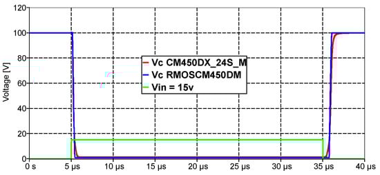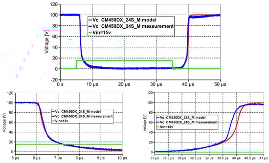 Figure 9, Figure 10, Figure 12, and Figure 13 present the good matching of measurement and modeling results. Figure 9 (SKM200GB123D) and Figure 12 (CM450DX-24S) show the change in collector voltage of the IGBT transistor when a 15 V amplitude pulse signal is supplied to the GATE; as it can be seen from the figure, the shapes of the Fall and Rise signals are almost identical in the measured and modeled graphs. The IGBT transistor is supplied with a signal at GATE through 50 Ohm resistors. This allowed us to better understand the current processes at the GATE, which are the complex result of the process of charging and discharging the parasitic capacities of the transistor. Figure 10 (SKM200GB123D) and Figure 13 (CM450DX-24S) show the voltage change pattern on the GATE in the event of 50 Ohms. Here, it should be noted that the signal forms match each other quite well. Small time differences do not have a significant impact on the device modeling results.