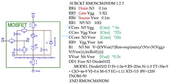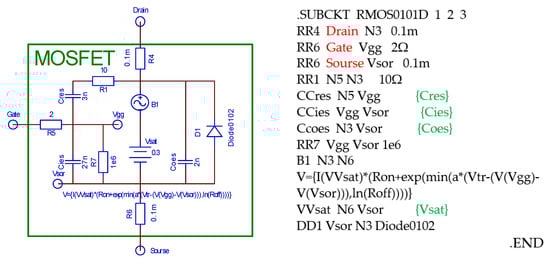 In the first model, we used three diodes (D1, D2, and D3) to describe them (Figure 2). For the MOS transistor M1, which is included in the IGBT (Figure 1) circuit, we replaced the voltage-controlled current source G1 (Figure 2). The formulas used in our model accurately describe the law of change in the capacity of the p–n junction, according to the voltage across the p–n junction.