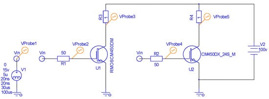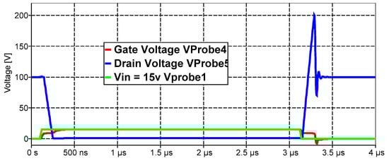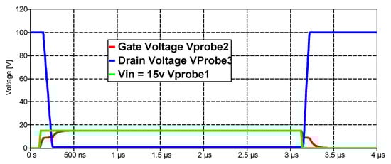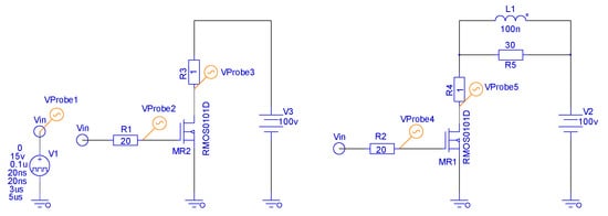 where a = 2 × (ln(Ron/Roff))/(Vtr − Vdr). The minimum and maximum values of resistance, Ron and Roff, respectively, are bounded (limited) by the “min” function. The rate of change of R from Ron to Roff depends on coefficient “a.” In general, the selection of the value of “a” should be done with the help of an optimization program. (The given formula is its empirically selected best option.) In Figure 15, the simulation design for RMOS0101D is represented with resistive and inductance loads. Figure 16 and Figure 17 show the results of the modeling.