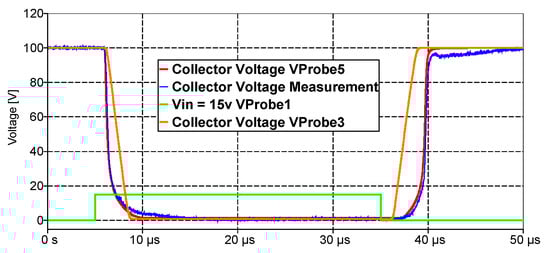 Using a test bench (Figure 6), we measured voltage waveforms using an oscilloscope (Lecroy WaveRunner 04Xi 2 Ghz 10 GS/s) at the collector (Figure 7a, Probe 3) and at the gate (Figure 7a, Probe 2) of the IGBT for different levels of pulse input voltage (Figure 7a, Probe 1). Parameter adjustment was considered complete when the equivalent circuit could describe the behavior of the IGBT module with minimum errors in all working modes that were measured.