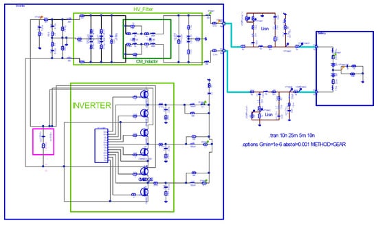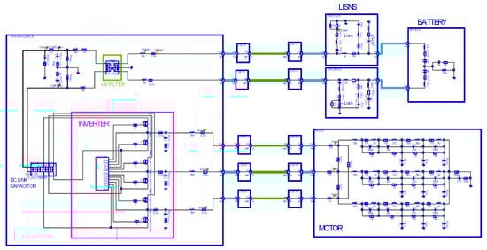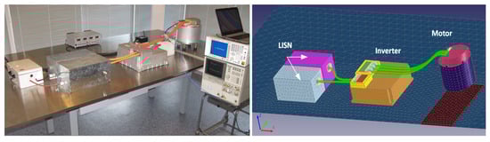 A complete model of this stand was created, including the inverter with space vector pulse width modulation, DC link capacitor, high-voltage filter, line impedance stabilization networks, simplified battery model, and motor and cable models. Modeling was performed in stages. First, we measured the S parameters of the filter and then determined the internal structure of the CM coil using X-ray computed tomography. Based on this information, we created a CM inductance model. Then, the complete filter model was created. Using the same method, the DC link capacitor and motor models were developed, along with an inverter model with SVPWM modulation. The modeling was done using EMCoS Studio, which allowed the creation of high-voltage cable models to assemble and calculate the complete power train system model. Figure 25 shows the full model of the stand.