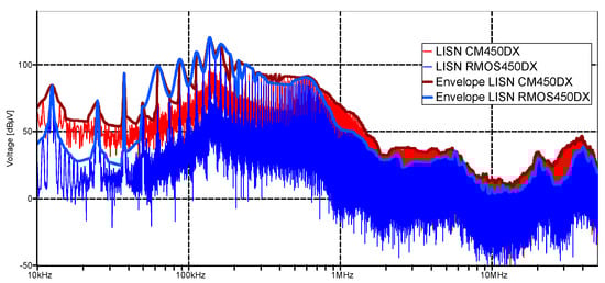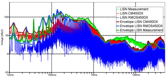 Modeling comparison for CM450DX and RMOS450DX models showing spectra of the LISN.