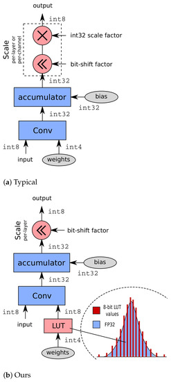 (a) Typical fixed-point compute engine of a convolutional layer; (b) our proposed fixed-point compute engine with a single per-layer power-of-two scale (bit-shift) and a lookup-table to translate 4 bit weights from storage to 8 bit weights for internal computation. The LUT is used to boost the expressive power of the engine through nonuniform weight quantization, which compensates the lack of high-precision scaling.
