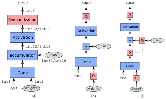 Figure 2b gives a typical simulated version of the compute engine from Figure 2a, where represents a fake quantization node. The precision of 32 bit integer operations is usually comparable to that of floating-points, which is why fake quantization nodes are omitted at the bias-add operation in Figure 2b, to save memory and computational overhead during training. If lower precision accumulators are used (e.g., 16 bit or less), the simulated scheme in Figure 2c is preferred. Note that a fake quantization node before the activation function is also omitted because this simulation assumes that the activation function will be fused into the preceding convolution on the target device. If the activation function needs to be executed separately, an additional is likely needed before the activation function.