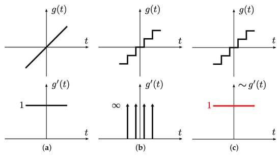 Figure 3a,b illustrates the transfer function of an identity function and a function, respectively, with their corresponding derivatives, while Figure 3c depicts a function using the STE principle. Using the STE, the local gradient of the fake quantizer (Equation (11)) w.r.t. input becomes:
