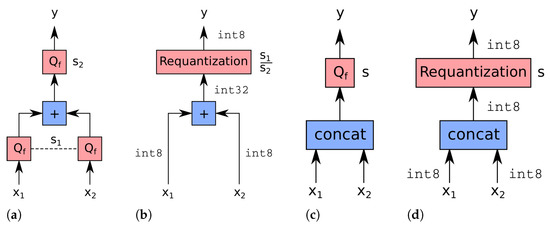 Fake quantized elementwise add (a), its implementation in hardware (b), fake quantized concat (c), and its implementation in hardware (d). The figures assume a uniform symmetric quantization scheme (only scale factors) for the sake of simplicity.