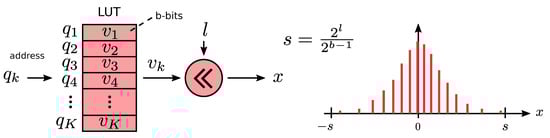 Some works chose nonuniform schemes in a way that they can be realized very efficiently in hardware. One of the most popular schemes is the powers-of-two scheme, since this scheme has the potential to replace all multiplications with shift operations, which are faster and more energy efficient. Zhou et al. [] proposed a training scheme where they incrementally replaced floating-point weights with powers-of-two weights during the QAT procedure. Li et al. [] proposed to use a sum of two powers-of-two terms, which has some advantages over regular power-of-two distributions. Zang et al. [] proposed LQ-Nets with a convolution engine that merely relies on bitwise operators, such as xnor and popcount, which can be executed very efficiently. Their engine supports a nonuniform quantization level distribution that can be trained and has a similar degree of freedom as the sum of power-of-two values. Faraone et al. [] proposed to use a Reconfigurable Constant Coefficient Multiplier (RCCM) instead of bulky DSP multipliers in their FPGA implementation. RCCMs multiply numbers merely by shift and addition operations. They proposed a method to estimate the RCCM design based on an RCCM supported coefficient set that matches the distribution of the data as close as possible.