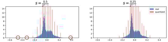 Linear or uniform refers to evenly distributed quantization levels among a given range. Uniform quantization schemes are usually preferred because of their simplicity and straightforward hardware implementation. Weight and activation data, however, tend to be nonuniformly distributed, as depicted in Figure 4. Several articles [,,,,,] proposed using quantization schemes with nonuniformly distributed quantization levels that more or less follow the expected distributions. Because weights tend to follow bell-shaped distributions, a more efficient precision/range balance can be achieved if more quantization levels are located close to the center and less levels are located further outwards, which results in higher accuracy. Proposed techniques in the literature include 1D K-means clustering of the weight/activation data, where the K cluster centers represent the quantization levels [,], cumulative histograms to create a mapping function that distributes the weights [], and many more.