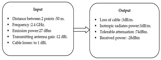 In order to evaluate the Wi-Fi network radio budget in the proposed site, an access point with a consumption of 12 W and high radiation power of 27 dBm was selected. The technical characteristics are shown in Appendix A (Table A1). Before the calculation, to find the optimal coverage, characteristics of the equipment were introduced in the simulator including access points, antennas, and cable losses. Figure 3 summarizes the input–output data using MATLAB code. If the receiver sensitivity is lower than the received power (−28 dBm), the connection is enabled.