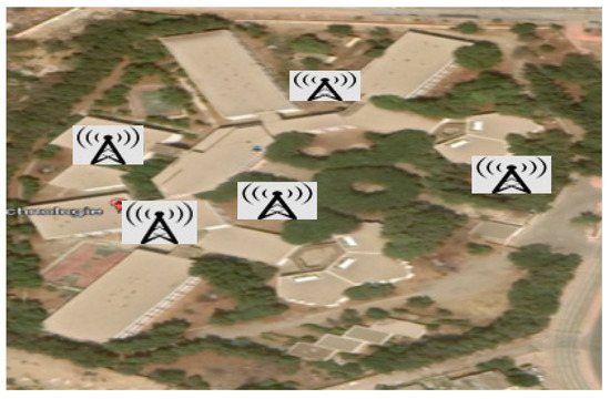 Using the MATLAB code, we estimated that at least five Wi-Fi access points to cover the whole campus are required. The impact of using lower and higher numbers of access points was also assessed. Figure 4 provides the optimal site for the five Wi-Fi access points.