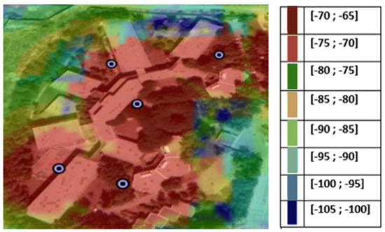 Once the location of the access points and their positions on the geographical map were identified, the frequency distribution for each transmitter on the network and antenna type were selected. During the dimensioning of the previously treated Wi-Fi network, an access point with specific characteristics such as the Wi-Fi compatibility standard, the transmission power, and the working frequency were selected. Afterwards, these parameters were introduced in the simulator code (Figure A2 in Appendix A). This will help estimate power received by a subscriber at each point. The predicted signal coverage for the ENST campus is shown in Figure 6. This helps assess whether the chosen locations of the access point are suitable.