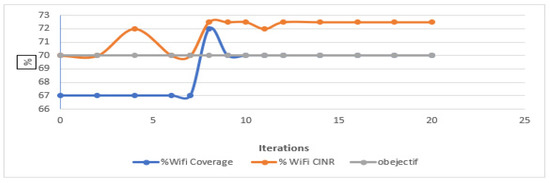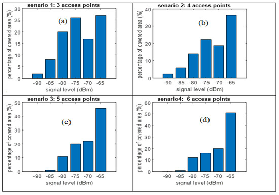 In this scenario, we managed to cover 47% of the total surface with a field level higher than −70 dBm and 39.6% of the surface with a level of signals between −80 dBm and −70 dBm (Figure 8c).