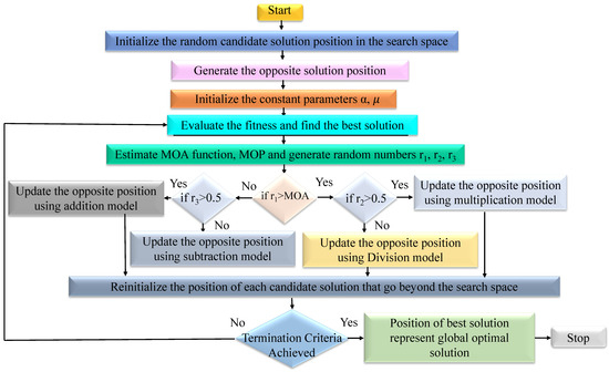 Flow chart of opposition-based arithmetic optimization algorithm.
