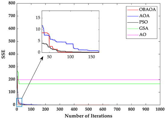 The minimum value of SSE is produced by OBAOA. The values of SSE are 9.03 × 10−4, 2.16 × 10−3, 1.489 × 10−3, 1.665 × 102, and 1.985 × 102, respectively for OBAOA, AOA, PSO, GSA, and AO.