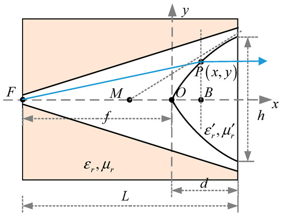In order to realize an ideal plane wavefront at the radiation aperture, the phase of the EM wave at any point on the aperture surface should be the same. Taking a wave path of FP for example, if the wavefront of the EM wave becomes flat in the E-plane when passing through the convex lens, the wave phase at point P(x, y) must be equal to that at point B(x, 0), according to the conclusions in [39,40,41]. Therefore, if and denote the propagation constants in the substrate and the lens, respectively, it can be obtained that: