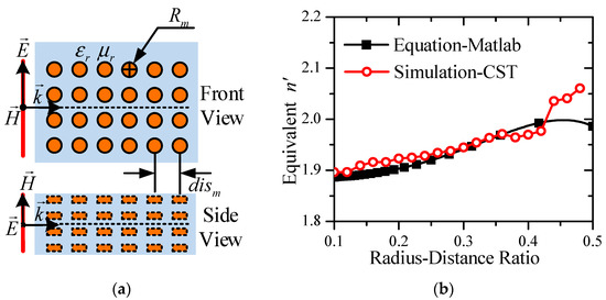 Multiple small metallic posts are uniformly placed into a medium with the relative permittivity and permeability of to form a metallic delay lens, with the post radius of and the center spacing of , as shown in Figure 2a. Similar to the derivation of equivalent permittivity and polarization characteristic of the ordinary medium, the small metallic post under an external electric field can be viewed as an equivalent dipole, and the relative permittivity of the metallic delay lens can be written as