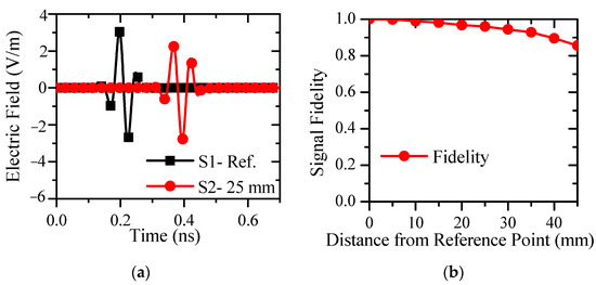The electric field signals at discrete points located on the central axis (the dotted line is shown in Figure 2a) of the metal post array are monitored to study the pulse fidelity, and the signal at the reference point being 10 mm away from the feed surface is chosen as the reference signal. As shown in Figure 3a, after 25 mm transmission from the reference point in the metallic delay lens, the monitoring signal S2 has a similar differential Gaussian main pulse to the reference signal S1, and the pulse waveform distortion is small. Figure 3b shows the fidelity between the reference signal and the monitoring signal at different positions from the reference point. It can be seen that the fidelity decreases with the increase of the transmission distance, and the pulse fidelity of the signals is 96% after a 25 mm transmission. The good time-domain performance of the metallic delay lens can be expected, because the equivalent refractive index of the lens is frequency-independent in theory, according to (10), and thus the propagation constant in the lens is linear with respect to the frequencies, which satisfies the distortionless conditions of the wave phase. Therefore, the proposed metallic delay lens will have a negligible effect on the short-pulse antennas.