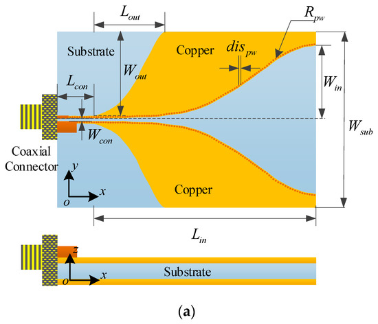 Figure 4a gives the front view and side view of the basic unloaded PWTSA with a planar size of 89 mm × 60 mm, and the Rogers 4003C laminate with a thickness of 0.508 mm and a relative permittivity of 3.55 is chosen as the substrate. The slot lines of the PWTSA are formed by two radiating copper patches printed on both sides of the substrate. Two arrays of metallic vias aligning along the slot edges are applied to connect the patches on opposite substrate surfaces to form the post-wall-structured slot which presents low characteristic impedance and thus can be fed by a coaxial connector directly. The post-wall-structured slot includes two parts, a constant width slot segment and a tapered slot segment. The inner tapered profile and the outer profile of the radiating patches are both defined by Gaussian functions as follows: