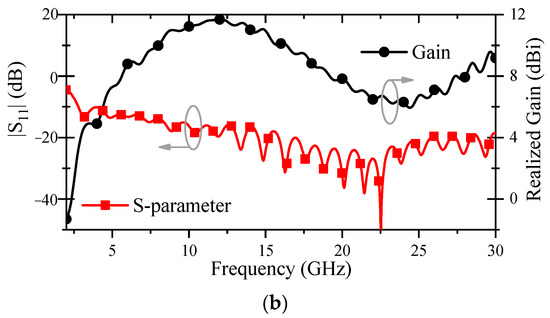 Figure 4b shows the simulated |S11| and realized gain in the end-fire direction of the conventional PWTSA, with the optimized dimensions listed in the caption of Figure 4. As shown in Figure 4b, the PWTSA presents a wide −10 dB impedance bandwidth from 2.8 to 30 GHz and a maximum realized gain of 11.7 dBi at 12.1 GHz. The gain decreases at higher frequencies due to the splitting and shifting of the main lobe, placing severe restriction on the operating frequency range of this antenna.