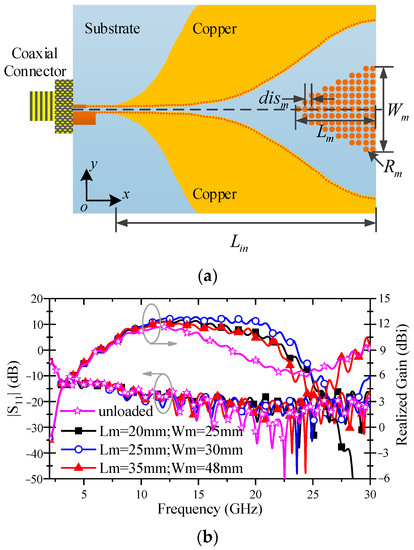As discussed in Section 2, loading appropriate metallic delay lens in the radiation aperture region of a conventional PWTSA results in radiation improvement, because the phase plane of the passing EM waves is altered to be a uniform distribution. As illustrated in Figure 5a, the PWTSA designed in Figure 4 is loaded with a metallic delay lens composed of a hyperbolic metal post array, to pursue the radiation improvement with no increase to the antenna size, which makes it possible to improve the antenna performance while maintaining the compact feature. The length and width of the metallic delay lens are denoted by and , respectively. The posts are etched through the substrate with a post radius of and center spacing between adjacent posts of . According to the comparison shown in Figure 2b, the radius-spacing ratio of the posts is chosen as 0.36 and then the equivalent refractive index of the metallic delay lens can be calculated as . As a result, when the radius of the posts is set to = 0.5 mm, the center spacing can be worked out to be mm.