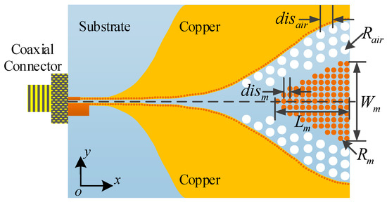 The metallic delay lens placed symmetrically around the central axis of the tapered slot results in a reduction of the phase velocity of the passing EM waves due to the larger equivalent refractive index. In contrast, an air-hole array etched through the substrate can increase the phase velocity due to the smaller equivalent refractive index. Therefore, the proposed metallic delay lens cooperates with an airy acceleration region consisting of an air-hole array placed near the slot edges can produce a more uniform phase distribution with more obvious radiation improvement. The combination of the metallic delay lens and the airy acceleration region is relevantly termed as a metamaterial-based lens. The configuration of the PWTSA loaded with the metalens is shown in Figure 6. The radius of the air holes is set to = 0.5 mm and the center spacing between adjacent air holes is set to mm, based on the optimized simulation results.