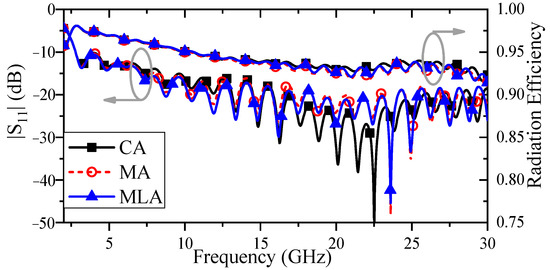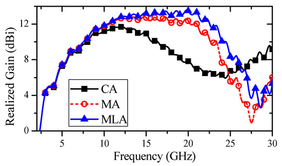 As shown in Figure 8, the realized gains in the end-fire direction of the MA and MLA are improved significantly in the high frequency band with a wider gain bandwidth compared to the unloaded CA. Due to the loading of the metallic delay lens, the realized gain of the MA is increased by about 0.5–5.14 dB from 9 to 24.7 GHz, and the realized gain of the MLA is increased by 0.5–6.4 dB from 9 to 26 GHz, due to the cooperation of the metallic delay lens and the airy acceleration region.